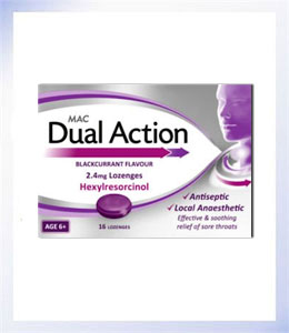 • Mac Dual Action Blackcurrant flavour lozenges are recommended for sore throats and associated pain.